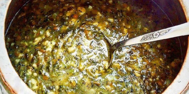 بعد برگ چغندر و کمی ترخان و ریحان و شنبلیله و (اندکی نمک و فلفل) داخل آن بریزید تا پخته شود و بعد آرد را خمیر کرده ، اوماج کنید. (اوماج به خمیرهای خرد به اندازه یک ماش را گویند) به مقدار ضرورت ریخته ، چند جوش داده بردارید.